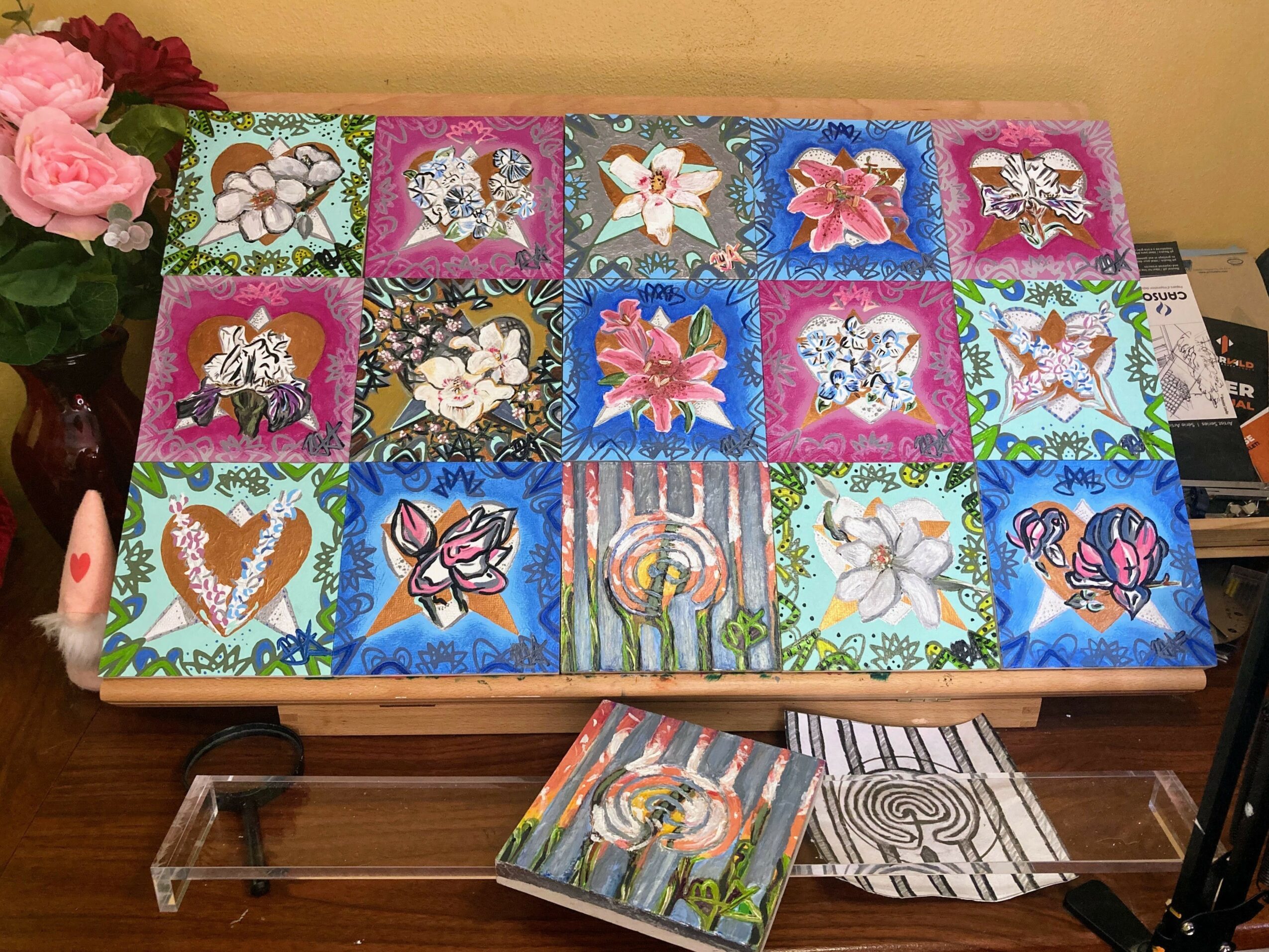 Additionally, I poured my heart into writing the first five chapters and completing 30 illustrations for the “At the Garden” project, a labor of love that has tested my perseverance. Alongside this, I designed my website with complementary materials: text, video/audio, and other resources. Each illustration, from the smallest detail to the medium-sized compositions, tells a story of dedication and resilience, embodying the essence of Time2Bloom™. I also created an additional six 6 in x 6 in artworks, totaling 36 pieces of three different sizes: minuscules, small, and medium works of art.